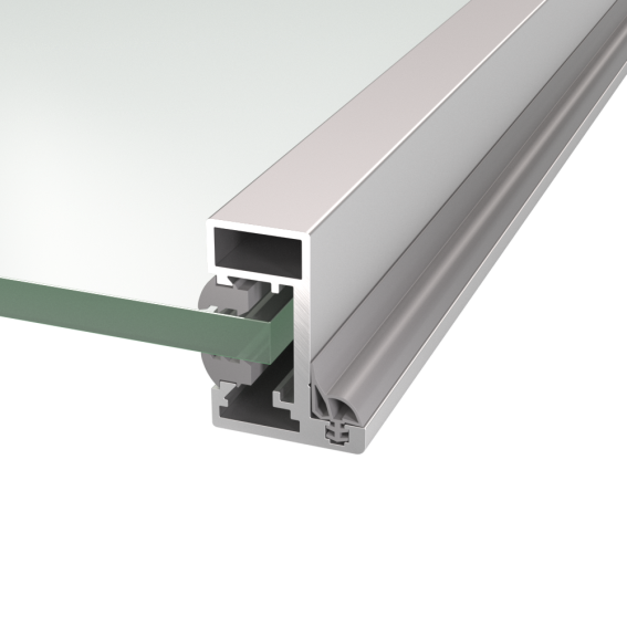 Zárubňový profil pre sklenené dvere s tesnením, rohové spojky a kotvenie k podlahe.